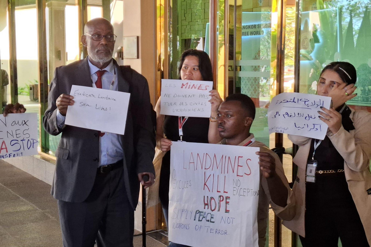 Die Aktivisten standen in langen Reihen am Eingang der Konferenzhalle und begrüßten die Delegierten mit Slogans in verschiedenen Sprachen: Antipersonenminen sind ausnahmslos geächtet! Die Weitergabe von Antipersonenminen aus den USA an die Ukraine ist nicht akzeptabel. Diese Waffen töten, verstümmeln und bedrohen immer zuerst die Zivilbevölkerung. Die Vertragsstaaten sollten jeden Einsatz durch irgendeinen Akteur unter allen Umständen verurteilen.